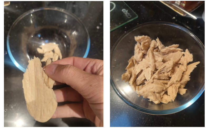 - Rip the fillets up into uneven chunks and place in a medium-small (about 1 litre) bowl
